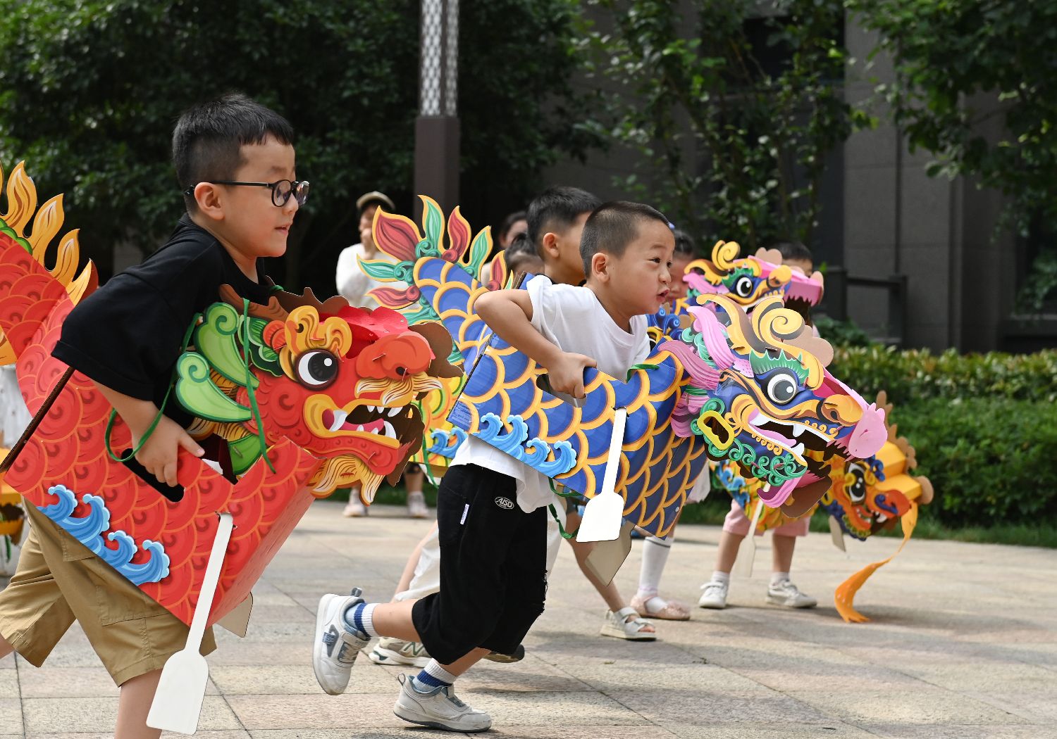 6月15日,中国安徽合肥,小朋友参加旱地龙舟比赛。(图片来源:中新社)