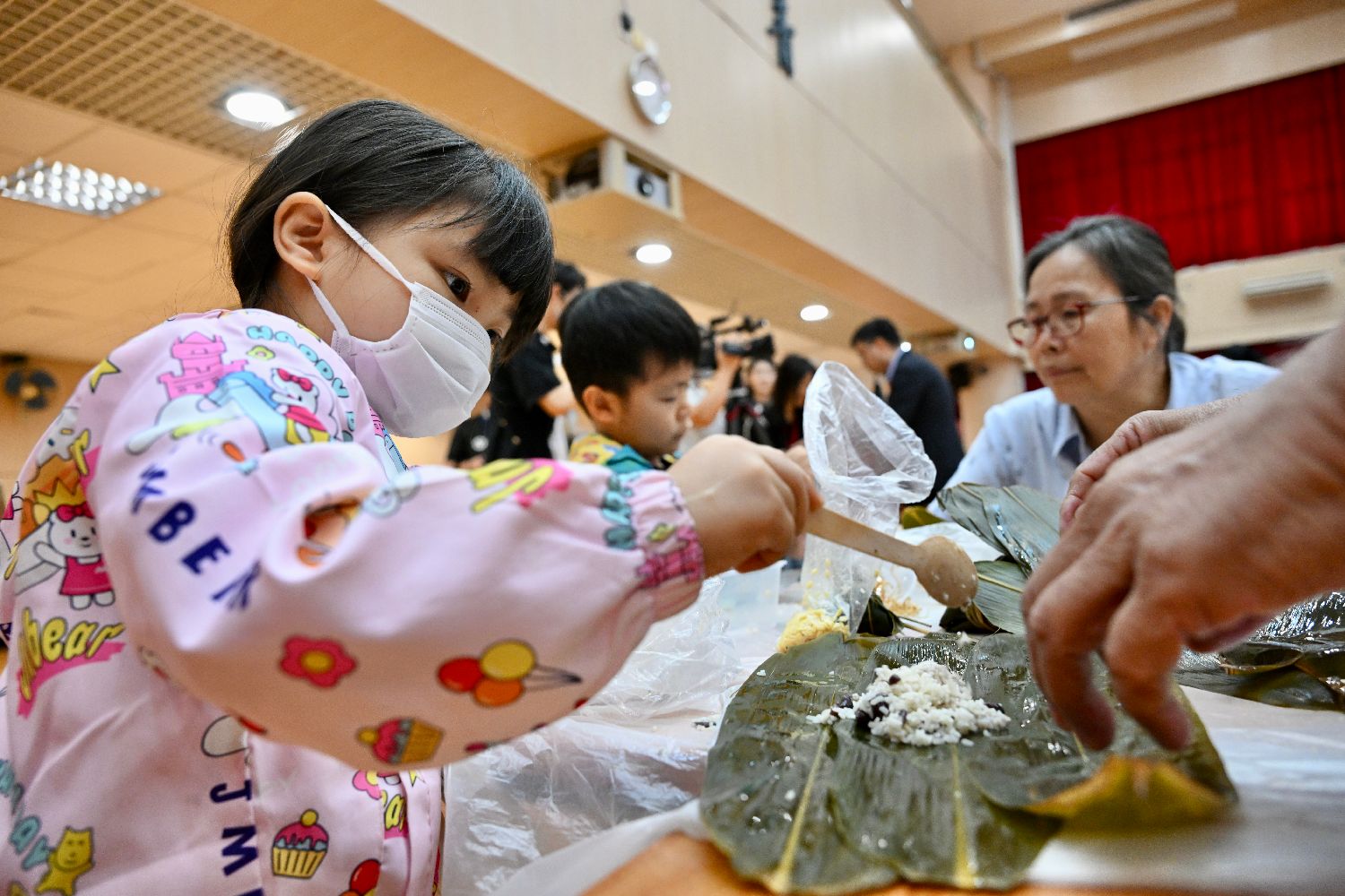 6月18日上午,由紫荆文化集团主办的2023年香港青少年端午节嘉年华暨紫荆“万水千山粽是情”关爱送粽公益活动在中国香港汉华中学举行。超过50组学生及家长参与包粽子大赛。图为儿童学习包粽子。(图片来源:中新社)