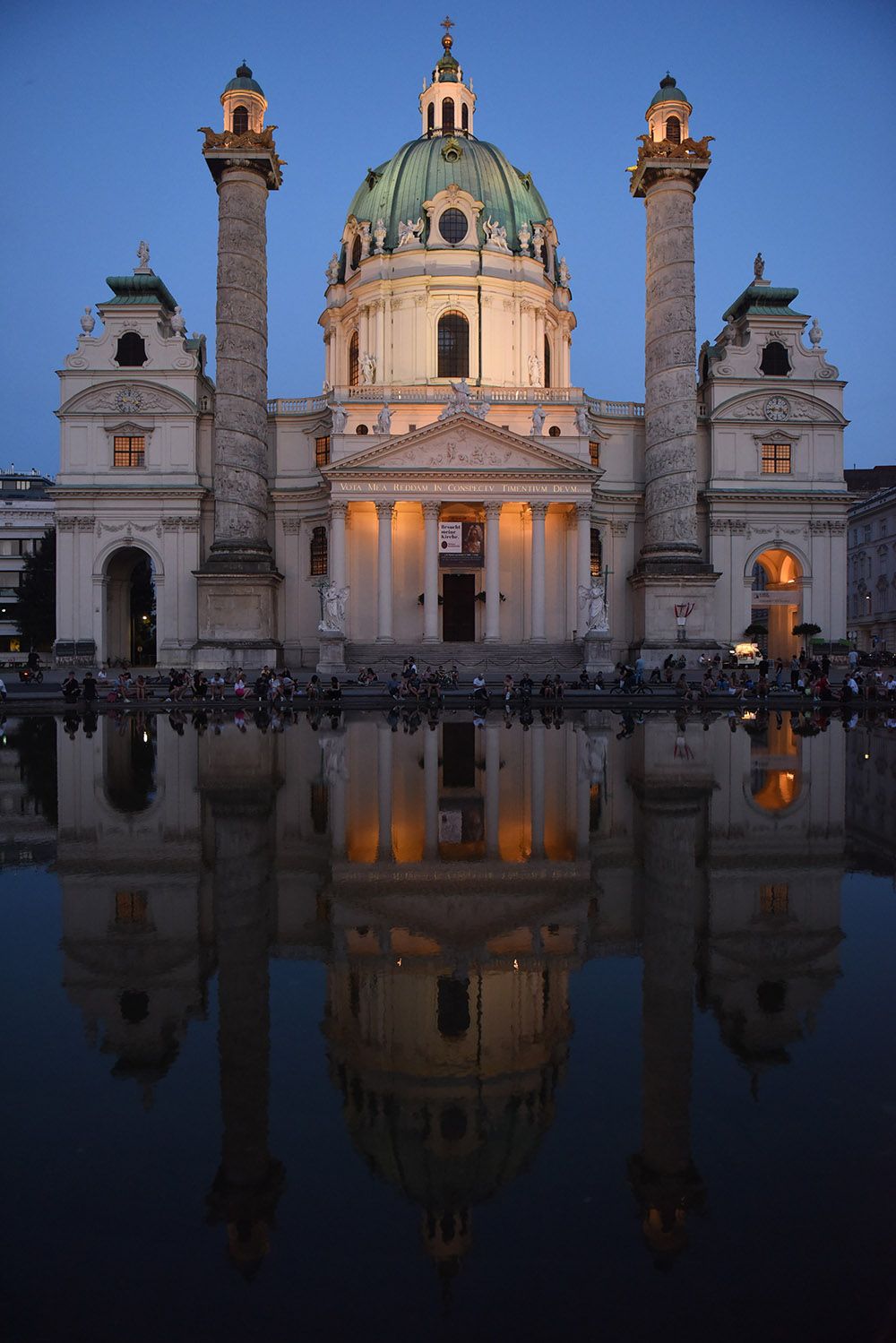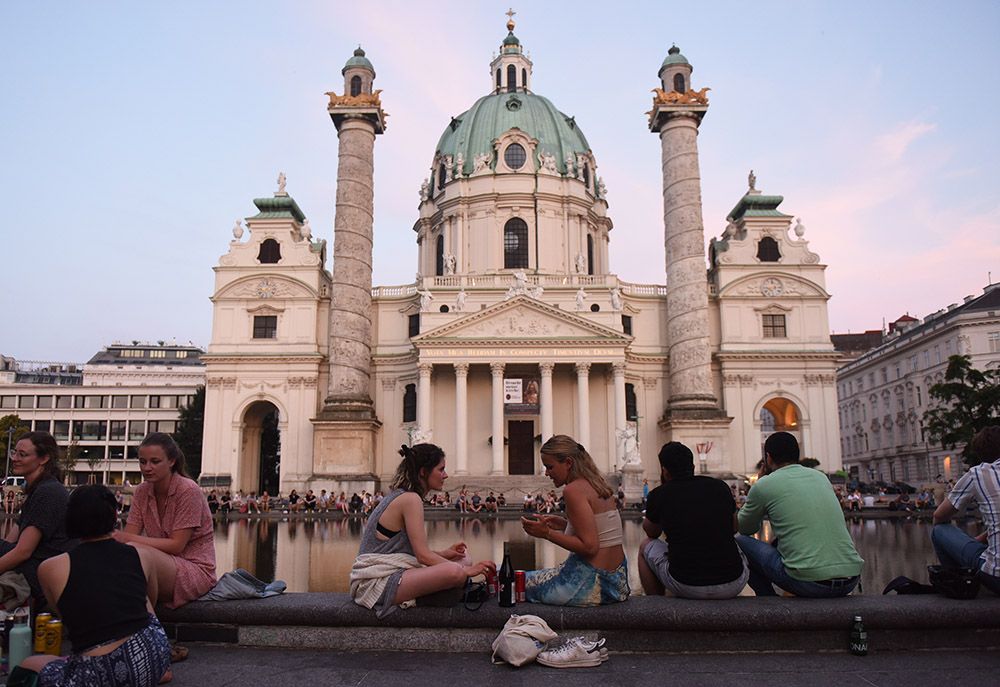 游客在维也纳查理教堂前休憩。(图片来源:新华社)