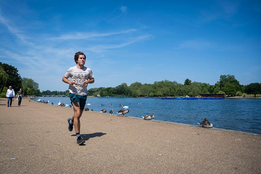 一名男子在英国伦敦海德公园内跑步。(图片来源:新华社)