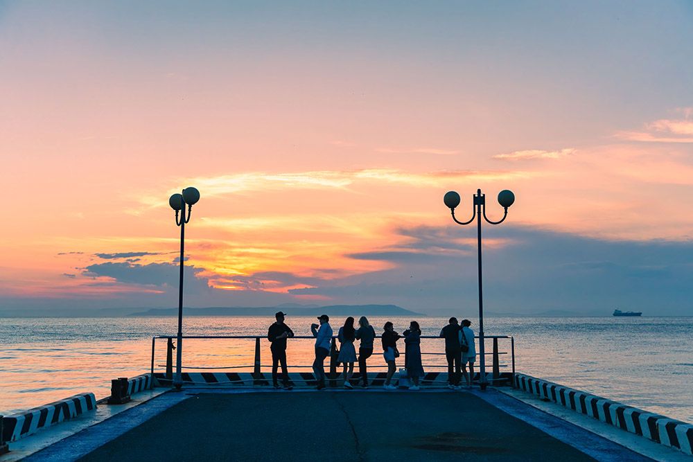 人们在俄罗斯符拉迪沃斯托克的海边欣赏落日。(图片来源:新华社)