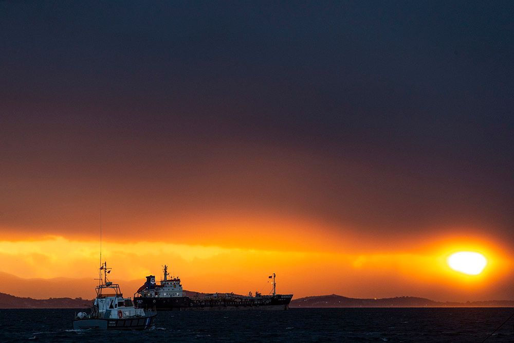 在希腊雅典西部的埃莱夫西斯拍摄的落日景象。(图片来源:新华社)