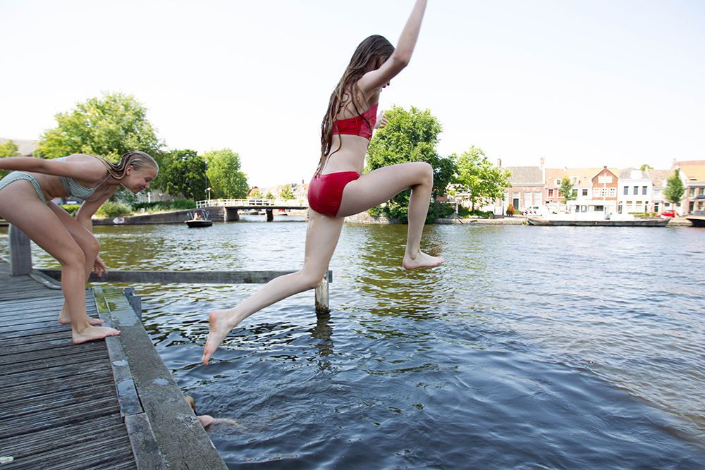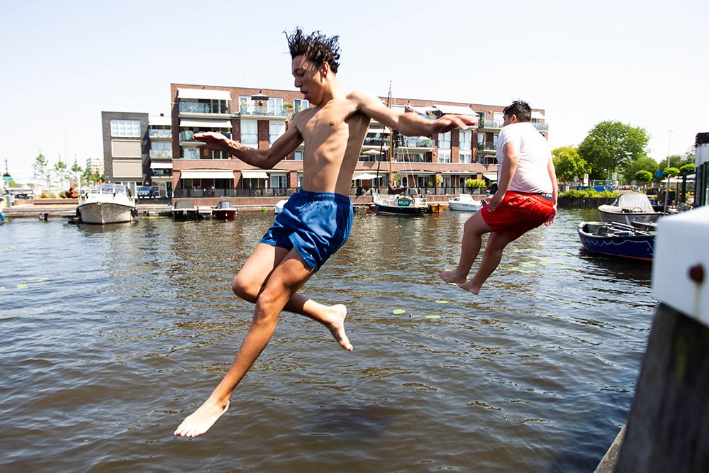 在荷兰哈勒姆,两名少年跳向水中消暑。(图片来源:新华社)