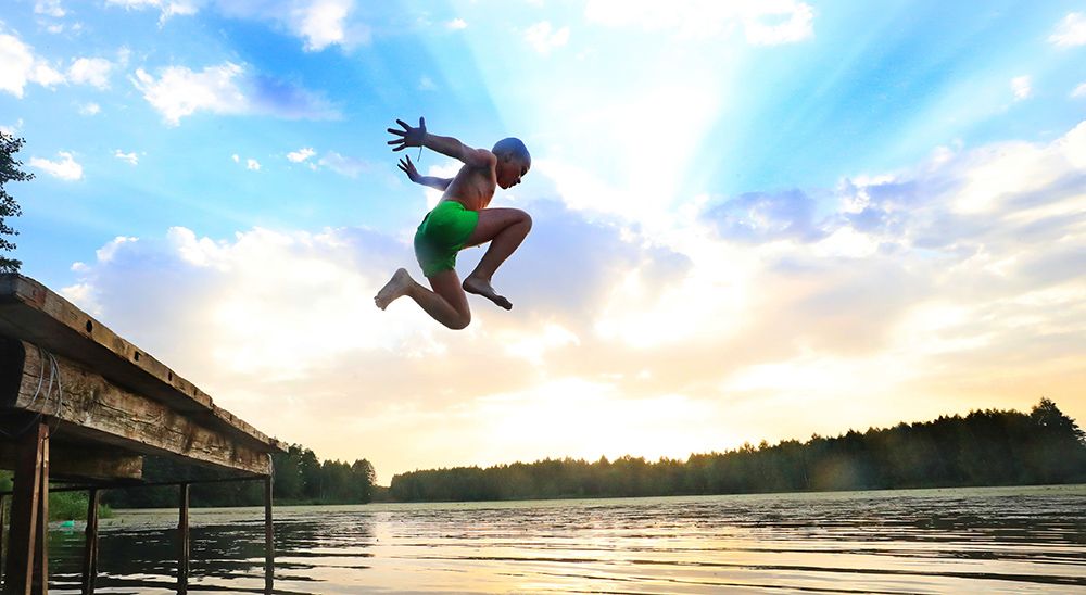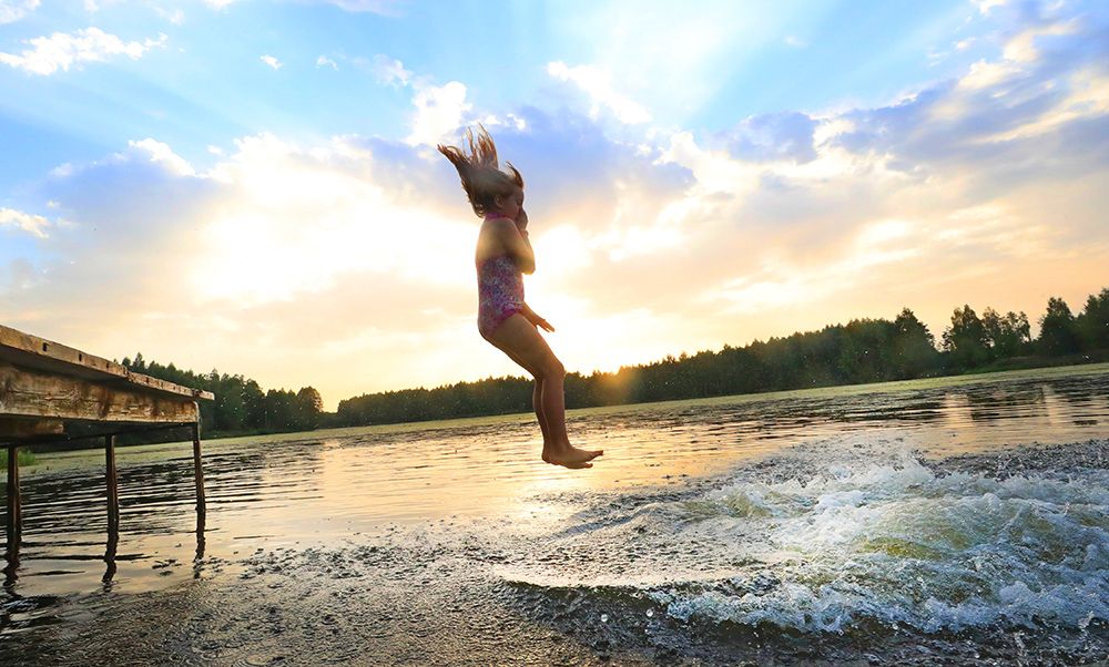 一名儿童在白俄罗斯明斯克州一个池塘跳水消暑。(图片来源:新华社)