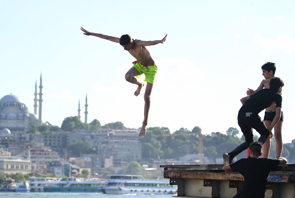 一名男孩跳入土耳其伊斯坦布尔的博斯普鲁斯海峡游泳消暑。(图片来源:新华社)