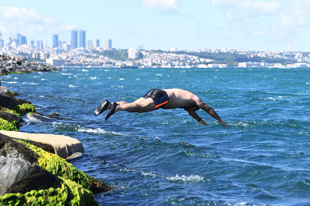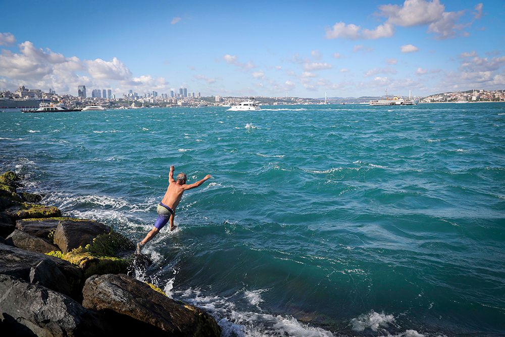 一名男子跳入土耳其伊斯坦布尔的博斯普鲁斯海峡。(图片来源:新华社)