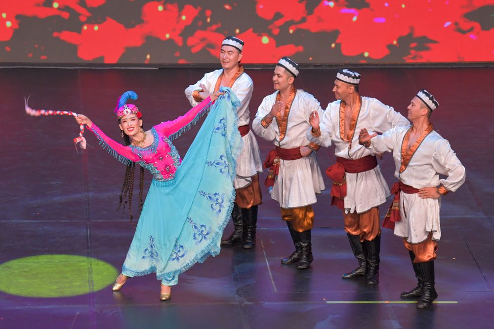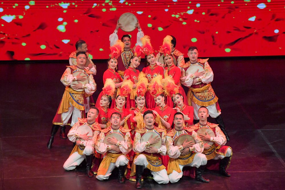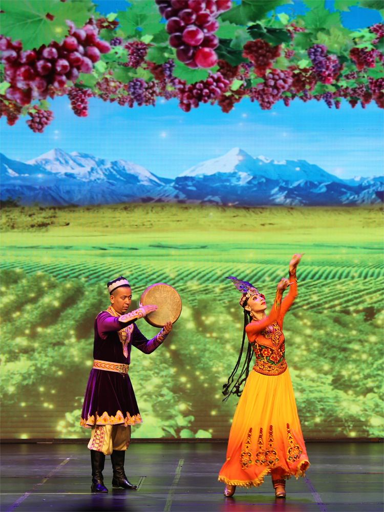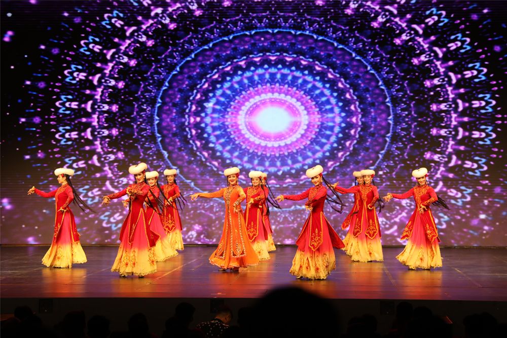 新疆艺术剧院木卡姆艺术团演员表演舞蹈《打起手鼓唱起歌》。(图片来源:新华社)