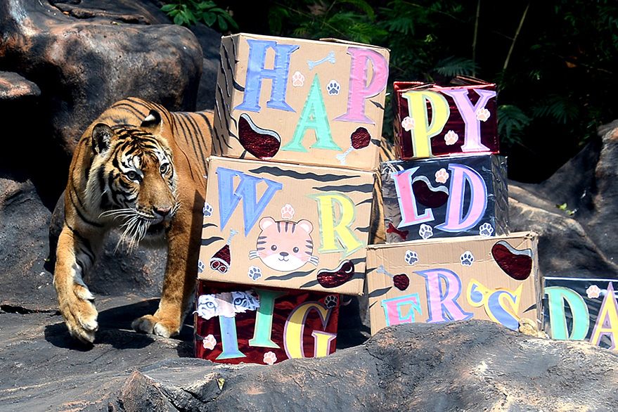 7月29日,在印度尼西亚玛琅的一所动物园,工作人员为苏门答腊虎准备了写有“全球老虎日快乐”字样的“礼物”。(图片来源:本文图片除标注外均自新华社)