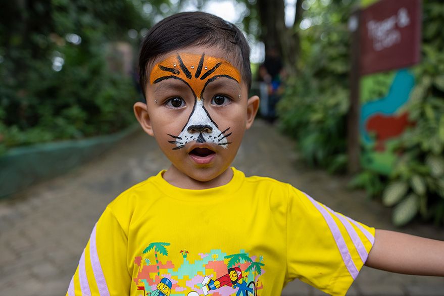 7月29日,在马来西亚吉隆坡附近的国家动物园,一名儿童脸上画着老虎元素的图案。