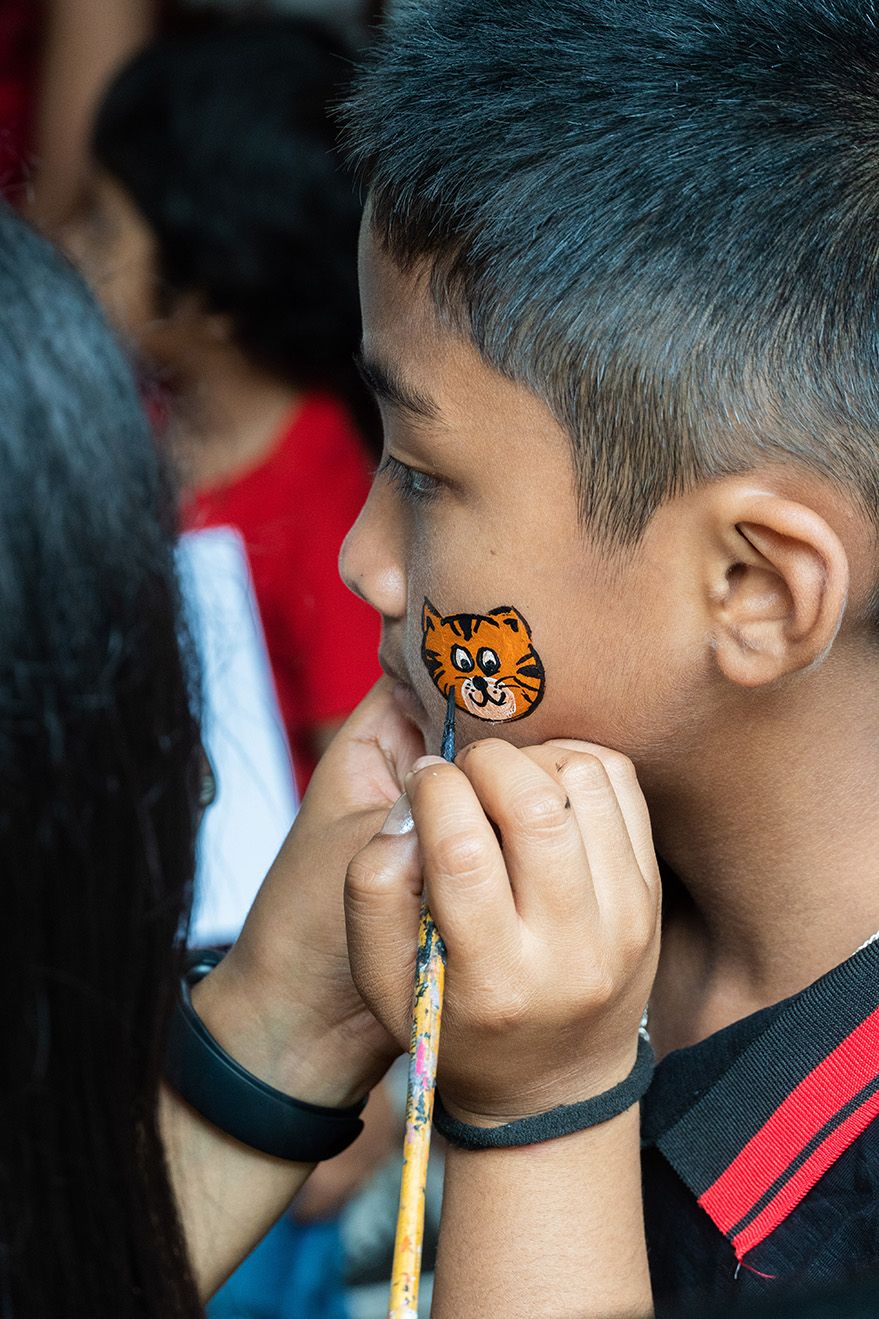 7月29日,在尼泊尔勒利德布尔的动物园内,一名男孩脸上画着老虎元素的图案。