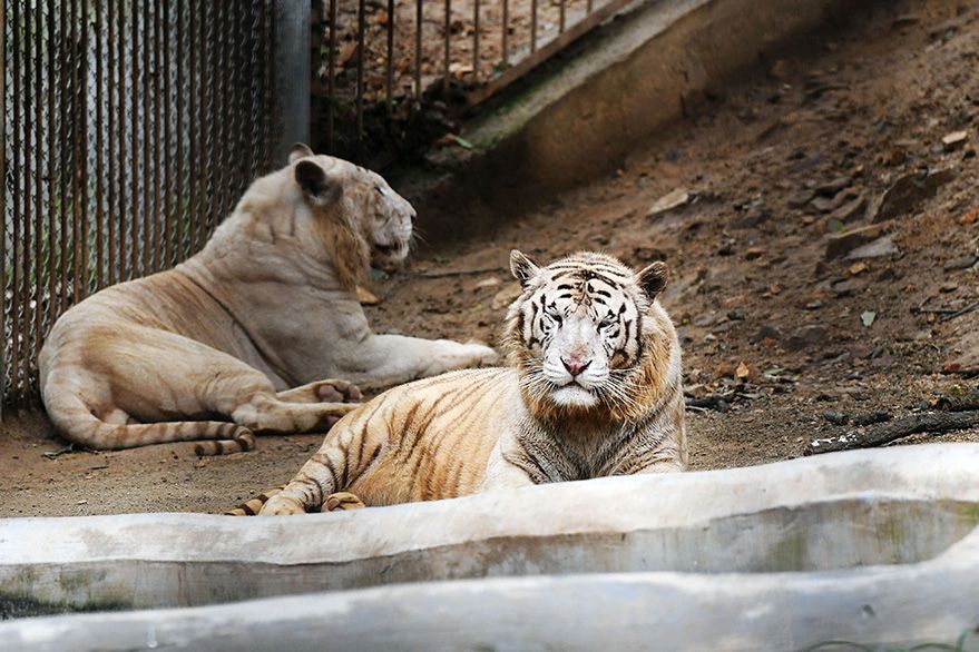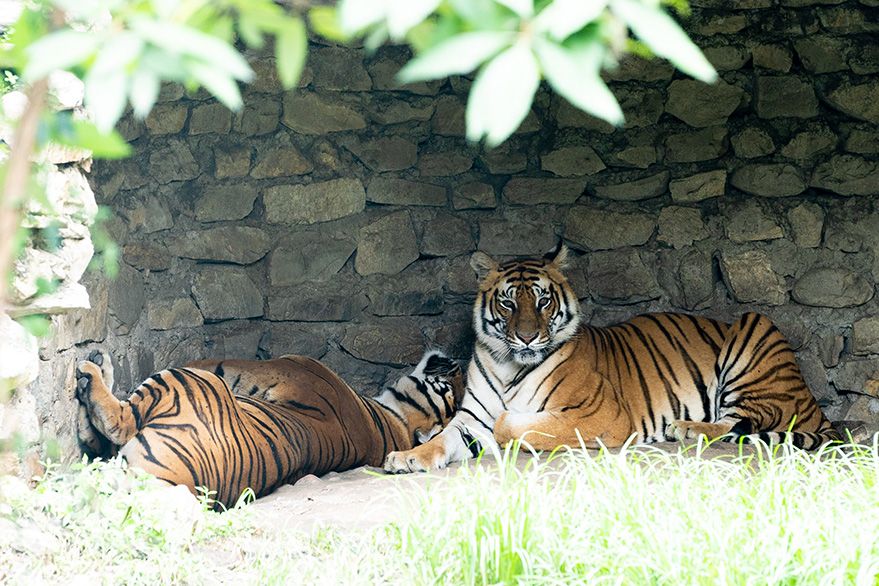 7月29日,山东青岛森林野生动物世界,2只孟加拉虎在园中憩息。(图片来源:中新社)