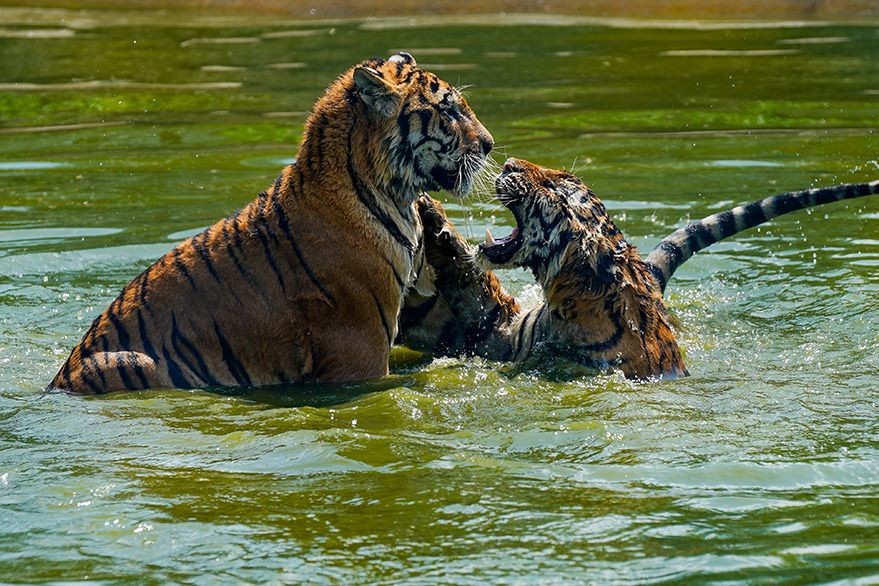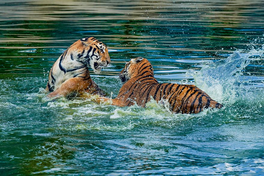 7月29日,黑龙江哈尔滨,两只东北虎在水中打闹。(图片来源:中新社)