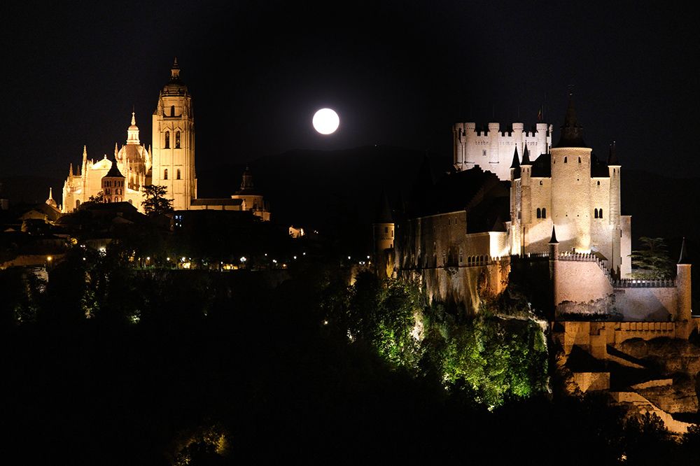 在西班牙塞哥维亚拍摄的“超级月亮”和塞哥维亚主教座堂(左)及塞哥维亚城堡。(图片来源:新华社)
