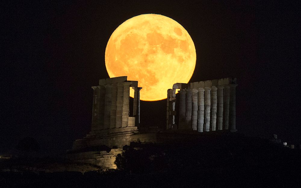 一轮满月在希腊雅典附近苏尼翁角的波塞冬海神庙上空升起。(图片来源:新华社)