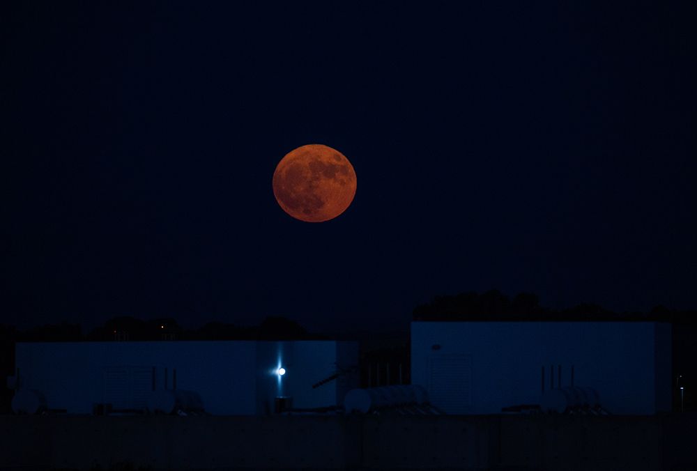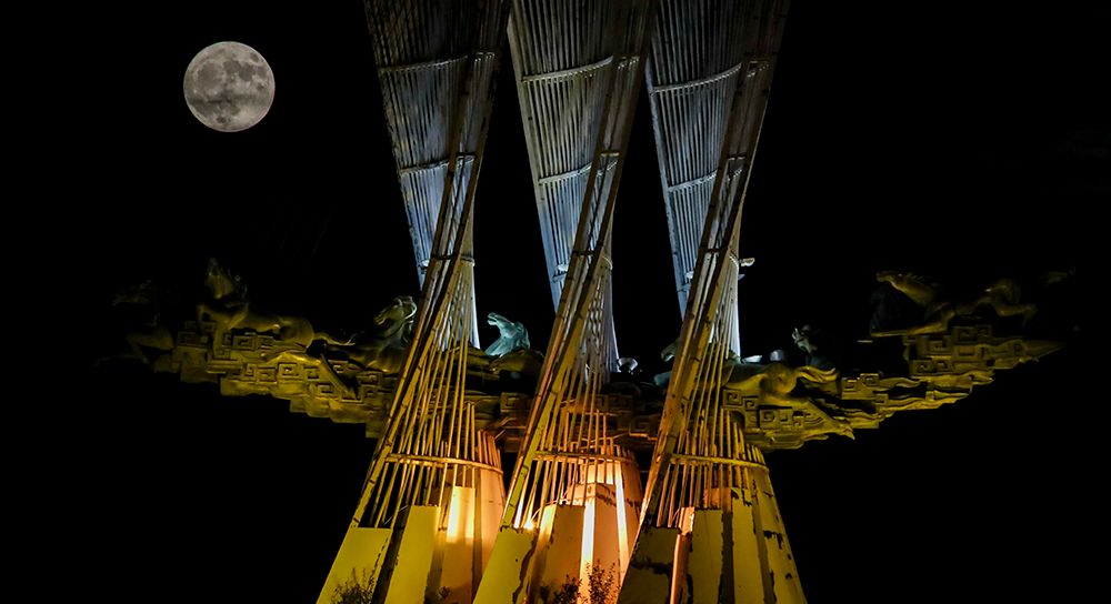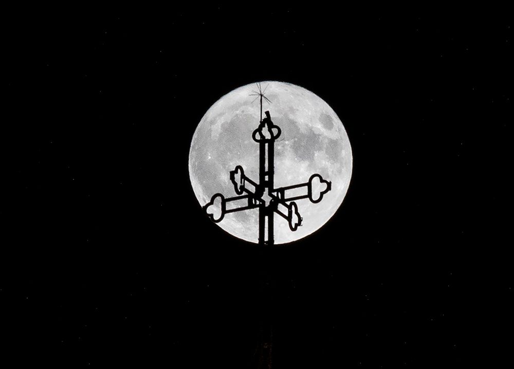 中国江苏省淮安市南船北马雕塑上空的“超级月亮”。(图片来源:中新社)