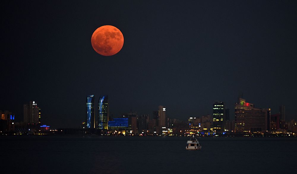一轮满月出现在科威特哈瓦利省上空。(图片来源:新华社)