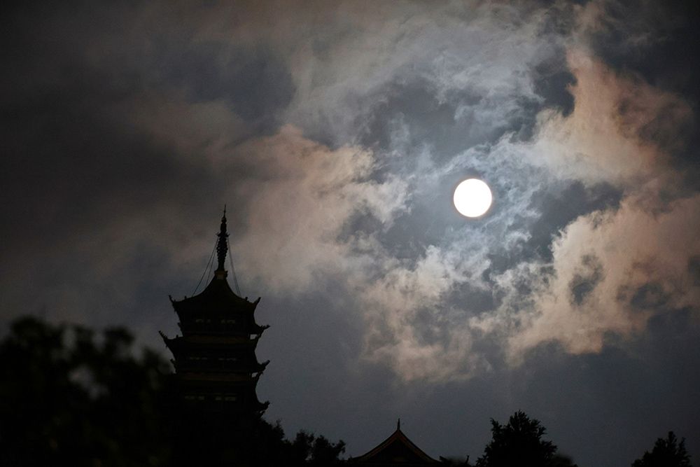 在中国江苏省狼山国家森林公园拍摄的月亮。(图片来源:中新社)