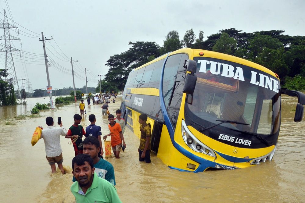 8月9日,在孟加拉国吉大港,一辆巴士被困在积水中。目前孟加拉国正值季风雨季,活跃的季风导致吉大港部分地区出现强降雨天气。(图片来源:本文图片均综编自新华社)