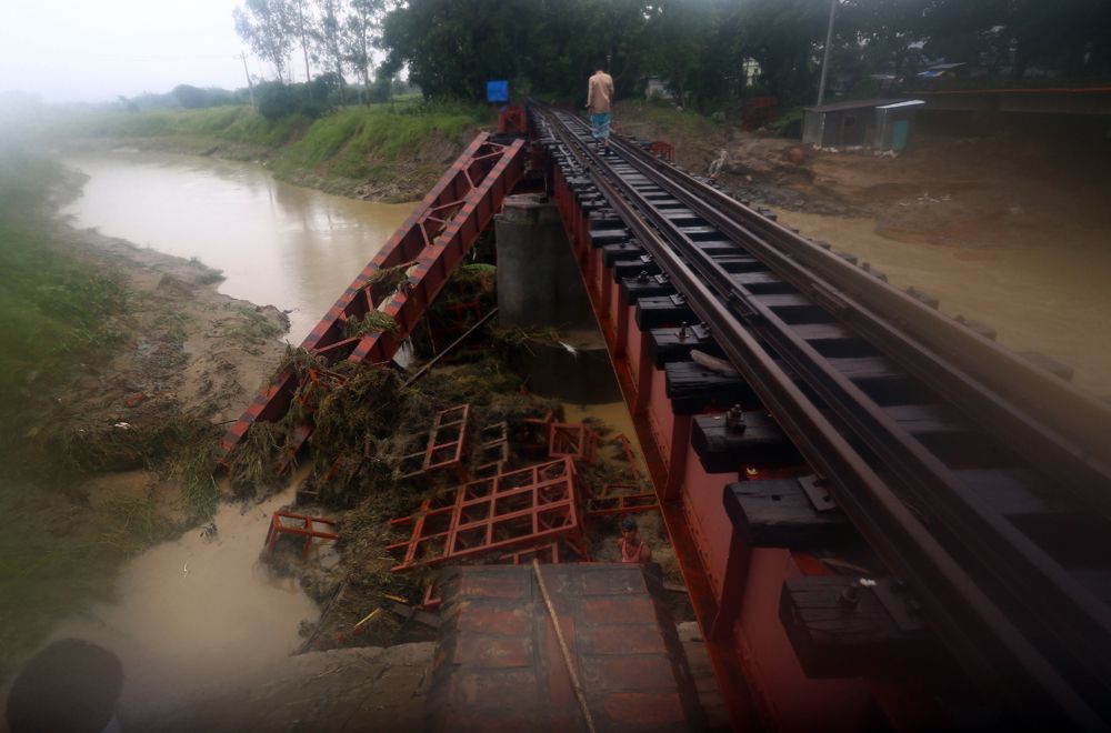 孟加拉国气象部门数据显示,截至当地时间7日6时,该国东南部吉大港地区24小时内降雨量为322毫米,为该地区今年最高降雨量。图为8月8日,在孟加拉国吉大港,铁路被洪水冲毁。