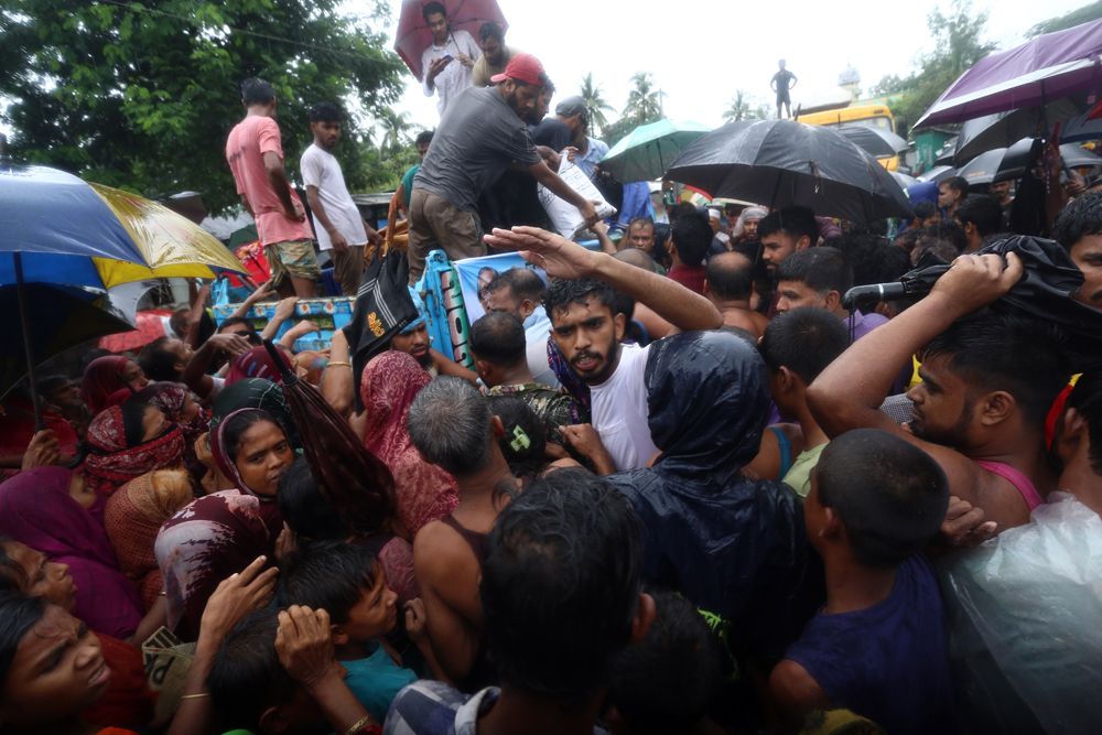8月8日,人们在孟加拉国吉大港领取救援物资。