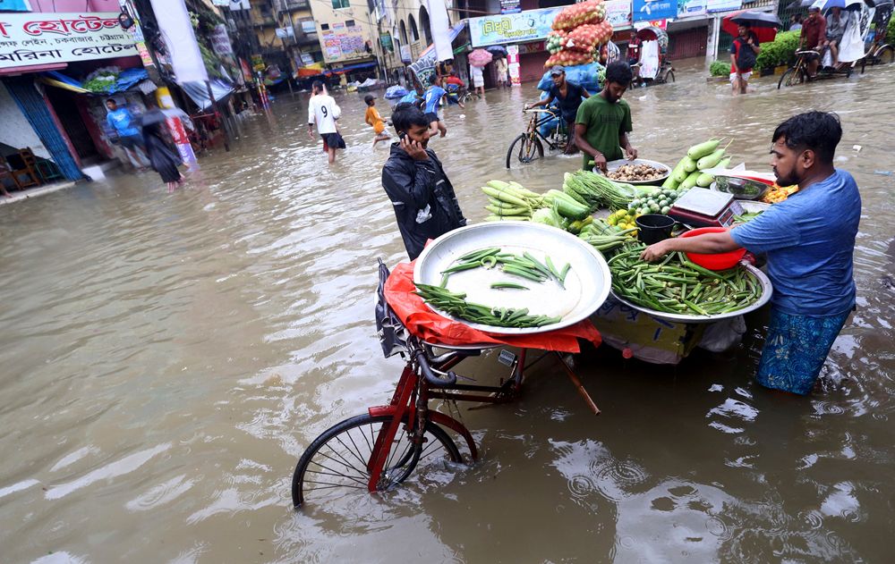 8月6日,商贩在孟加拉国吉大港一处积水的街区售卖蔬菜。受连日强降雨影响,吉大港部分区域遭遇洪涝灾害,给当地居民的出行和生活带来不便。