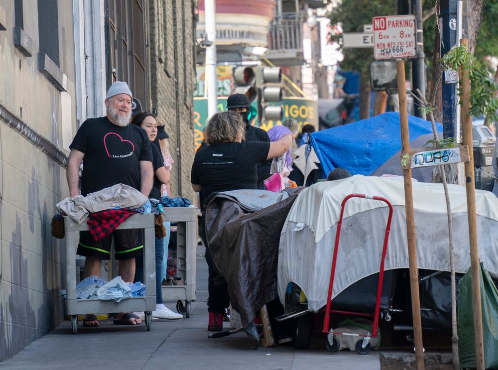 18日,慈善机构救世军组织的工作人员和志愿者在美国旧金山田德隆区街头分发食物和衣服。(图片来源:中新社)