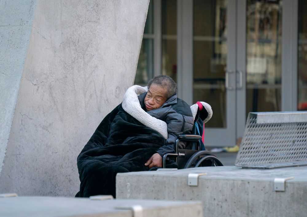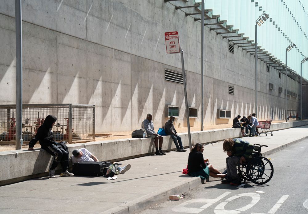 19日,一名无家可归者在美国旧金山联邦大楼附近逗留。美国无家可归者医疗保健委员会高级政策主任芭芭拉·迪皮特罗表示,或许有临时安置所总比没有好,但它并不能解决根本问题。在她看来,安置所往往限制多,在某些情况下甚至不安全。“这就好比你受了重伤,别人却给你一块创可贴。”她说,“安置所不是家。”(图片来源:中新社)