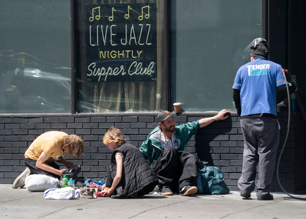 18日在美国加州旧金山市区的街道上拍摄的无家可归者(右)。(图片来源:新华社)