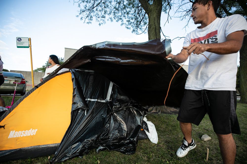 美媒分析指出,除居住成本上涨之外,新冠疫情期间援助政策的逐步结束也是无家可归者问题进一步恶化的原因。在部分地区,非法移民的涌入同样令无家可归者人数增加。 图为8月17日,在美国伊利诺伊州芝加哥第2区警察局外,一对移民情侣给帐篷盖上防水布。 据当地媒体报道,自2022年8月31日以来,美国得克萨斯州已将超过1.3万越境移民送至芝加哥。因移民迅速增加超过城市的应对能力,芝加哥2023年5月初宣布进入紧急状态。(图片来源:新华社)