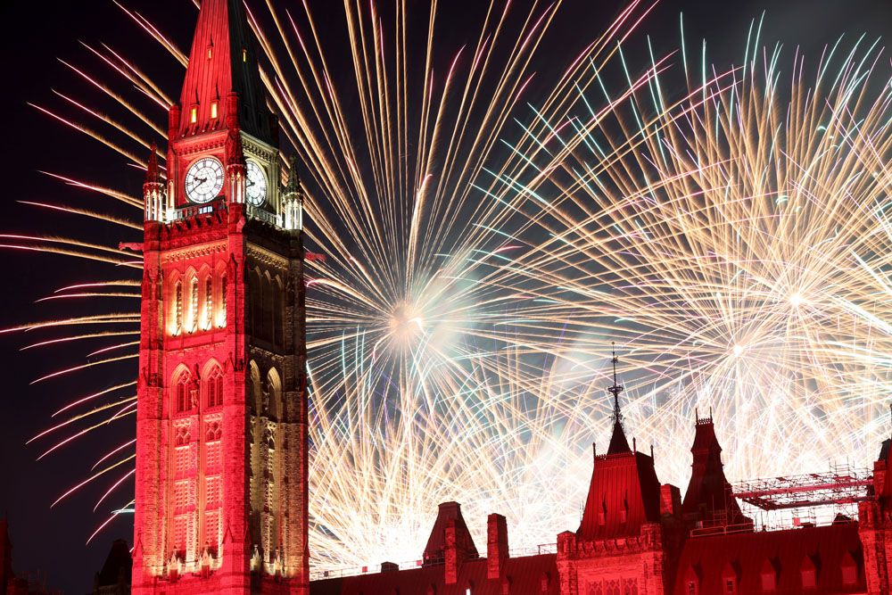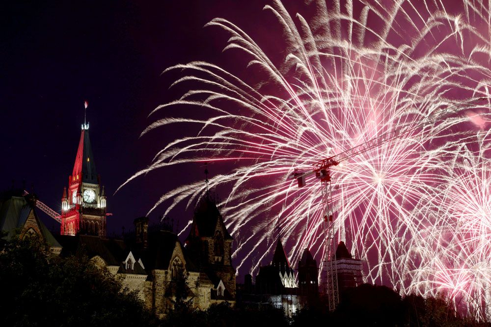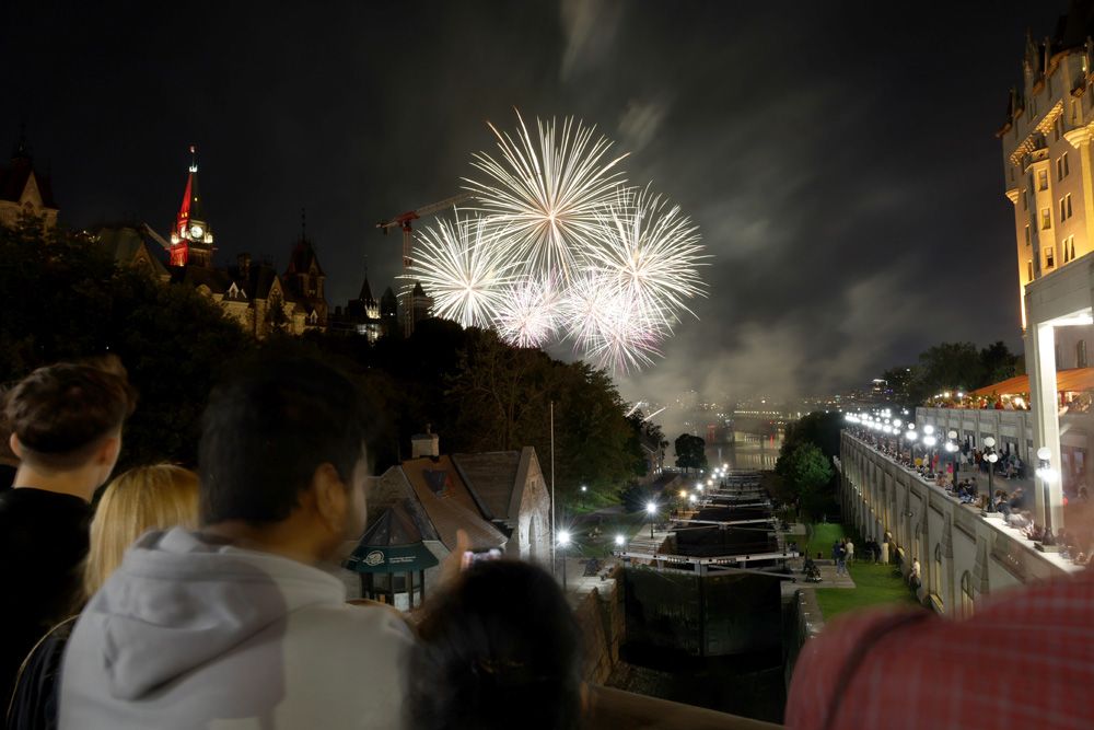 19日晚,第26届渥太华国际烟花节迎来最后一晚的烟花展演,吸引民众在国会山附近欣赏。(图片来源:中新社)