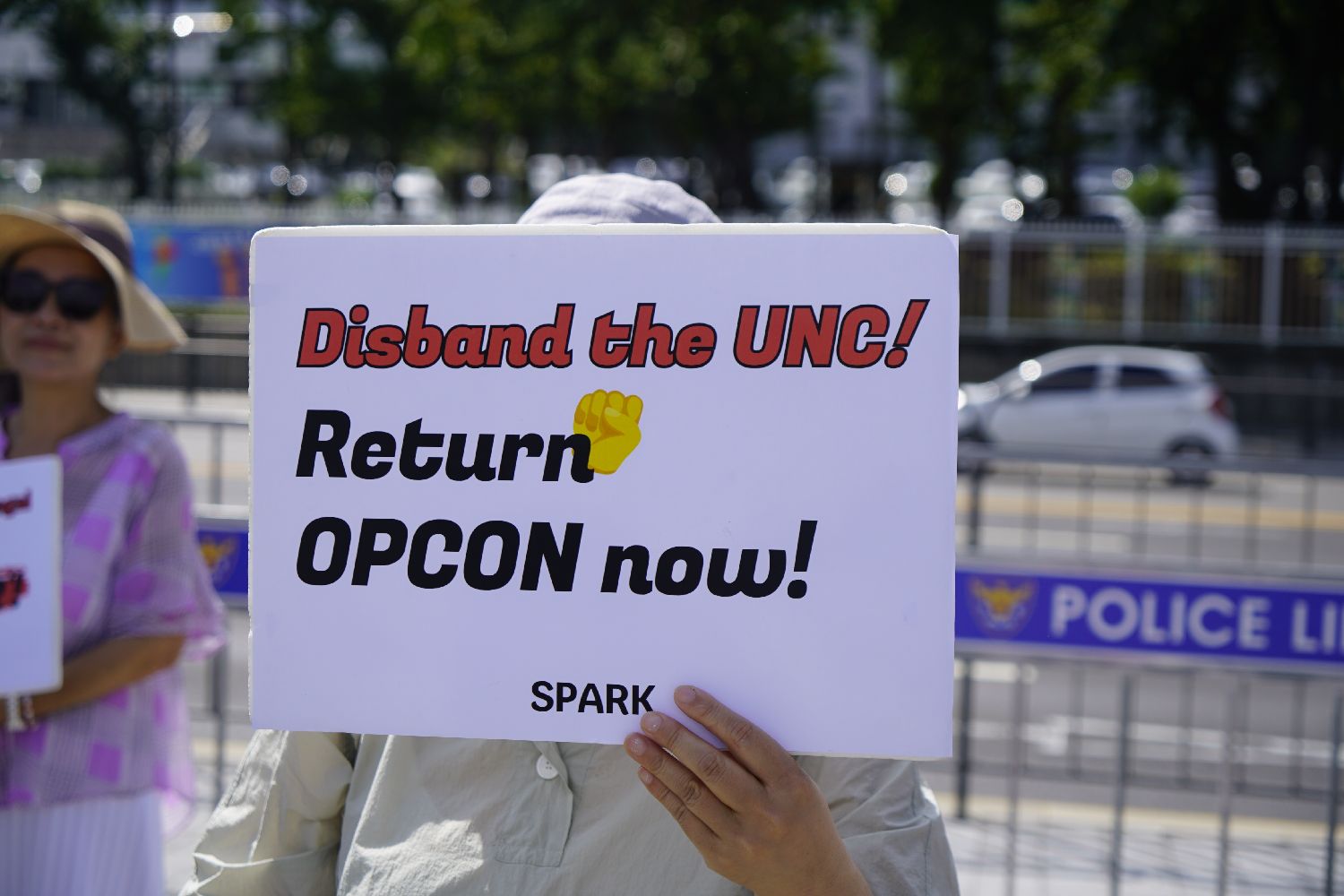 8月21日,韩国民间团体“和平统一开创者”举行抗议集会,敦促韩国政府停止韩美军演。图为集会中手持标语的民众。(图片来源:中新社)