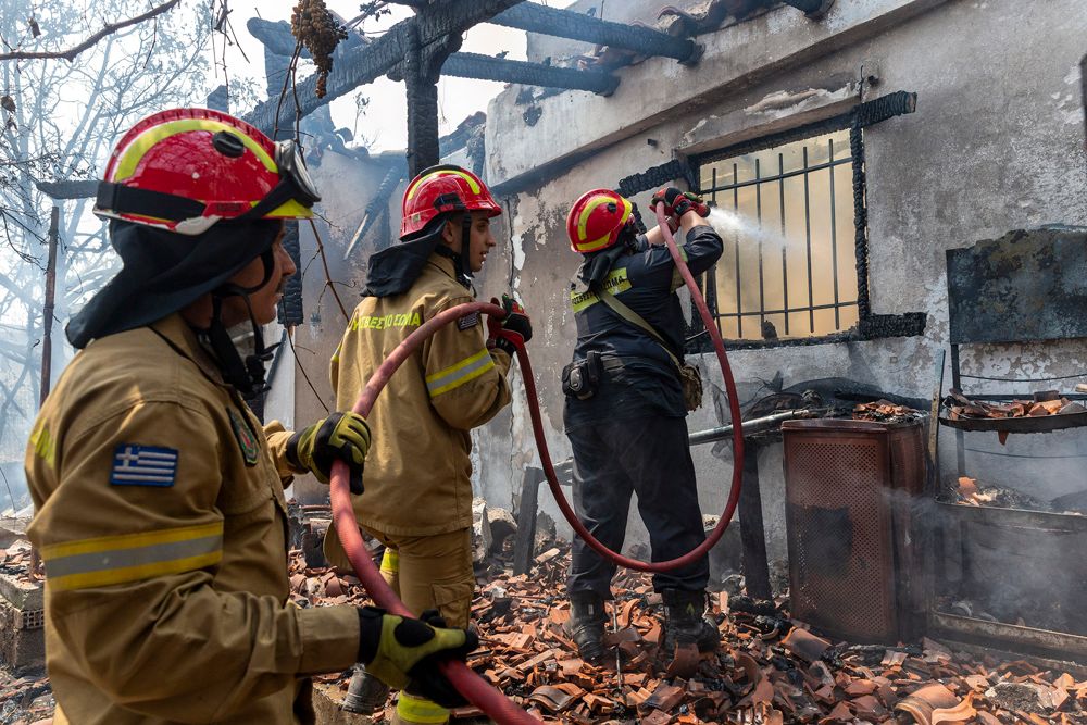 22日,消防员在希腊首都雅典附近的查西亚村灭火。希腊雅典通讯社报道说,希腊境内目前共有65处在燃野火,其中两处位于首都雅典所在的阿提卡大区,欧洲多个国家派出消防人员支援希腊的灭火行动。