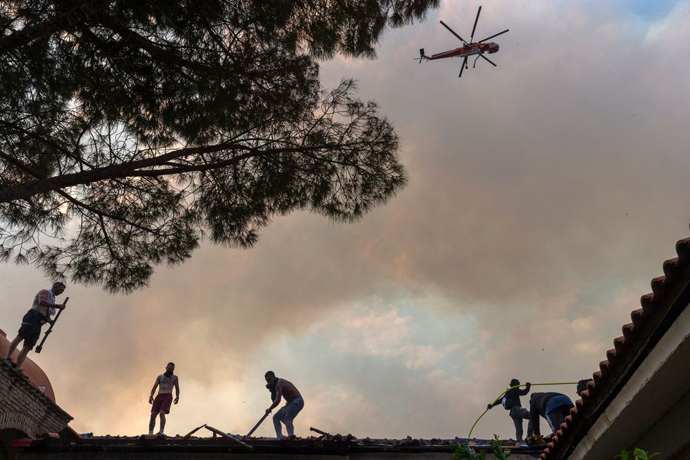 人们在希腊雅典附近参与灭火。
