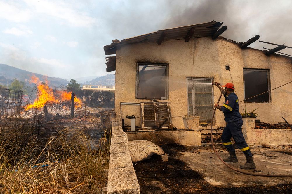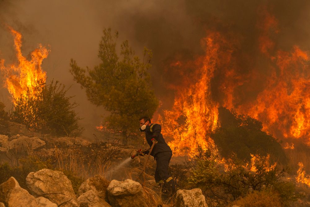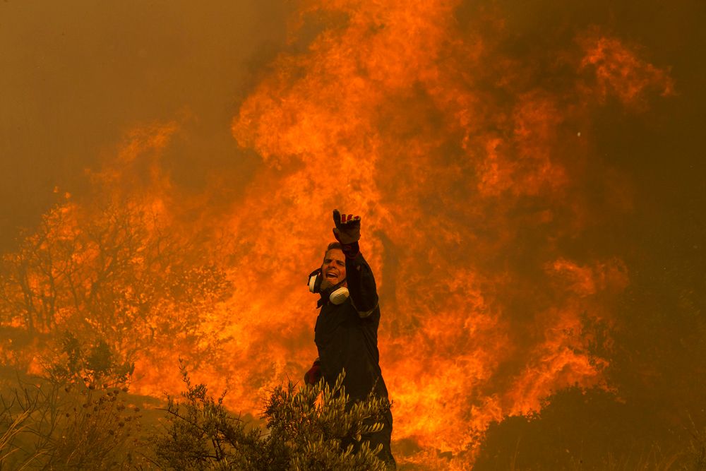 希腊多地野火持续燃烧,在高温和强风助推下难以控制。8月23日,消防员在希腊雅典附近参与灭火。