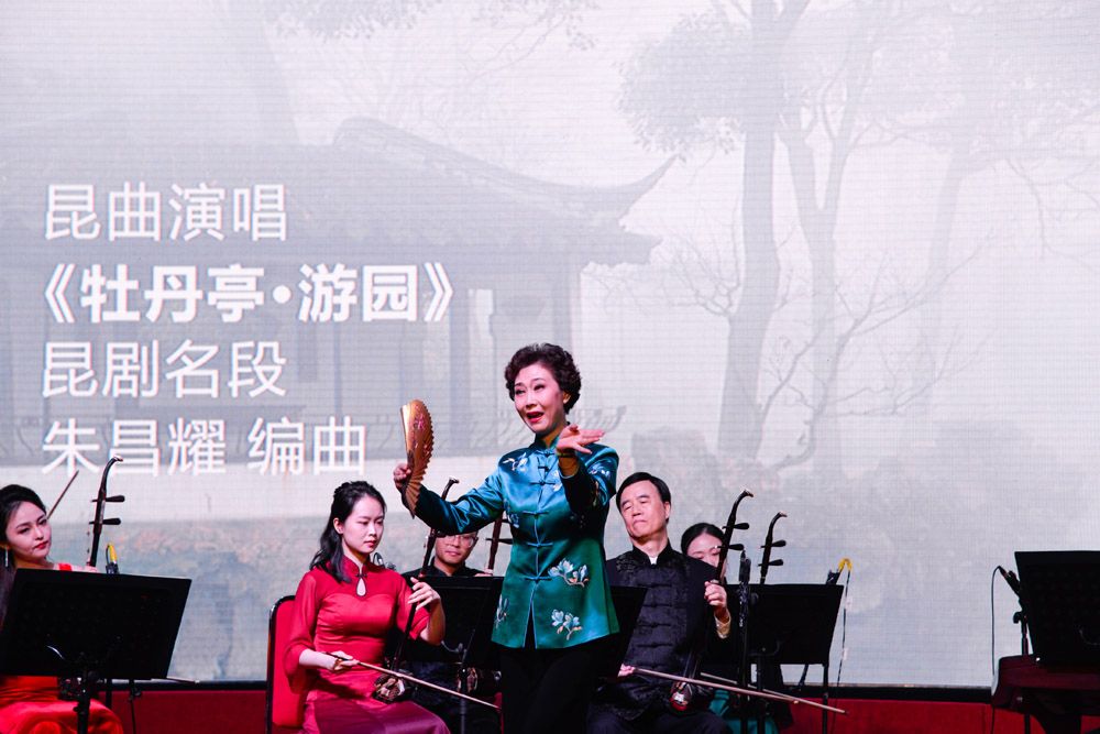 24日,在印度尼西亚雅加达太阳城,表演者演唱昆曲《牡丹亭·游园》。除了器乐演奏,观众还欣赏到昆曲知名曲目《牡丹亭·游园》,以及富有中国民族特色唱法的女声独唱《我的祖国》《青春舞曲》。(图片来源:新华社)