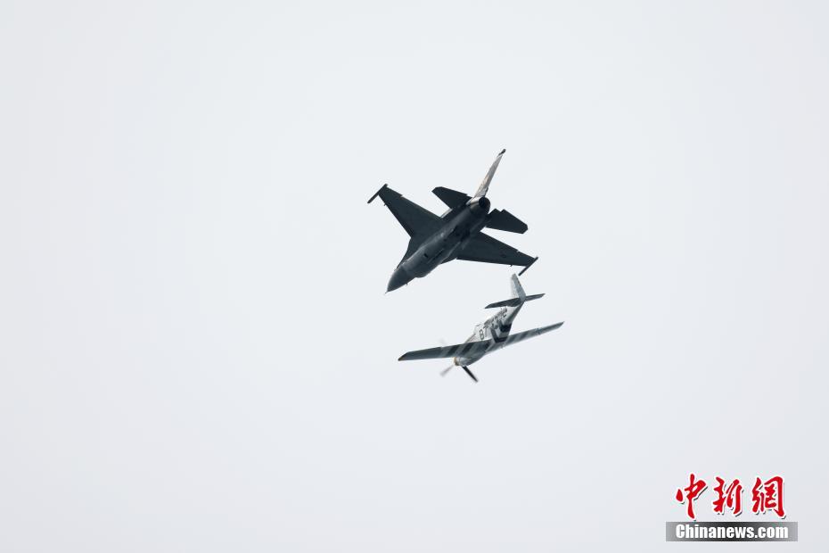 9月2日,美国空军一架F-16战机(上)与飞行爱好者驾驶的 P-51“野马”老式战机组队进行飞行表演。(图片来源:中新网)