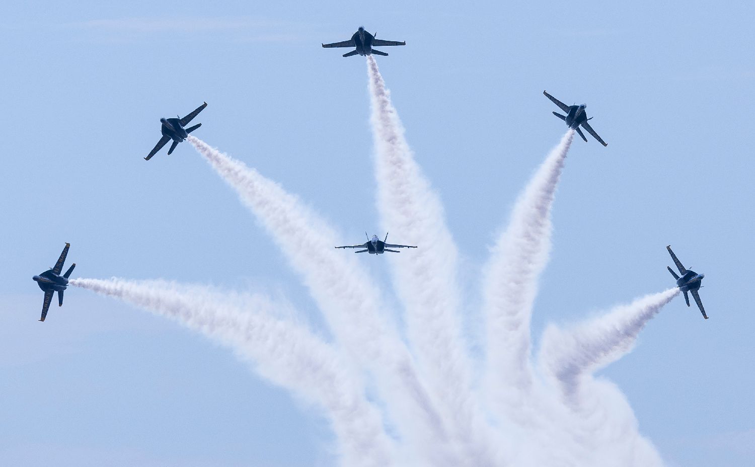 9月2日,美国海军“蓝天使”特技飞行表演队的编队进行飞行表演。(图片来源:中新社)