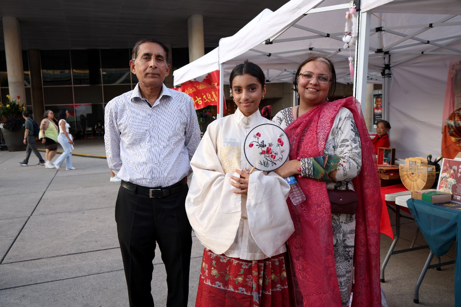 9月2日,在加拿大多伦多市政广场举行的第四届多伦多龙文化节上,一位印度裔少女体验穿着汉服。(图片来源:中新社)
