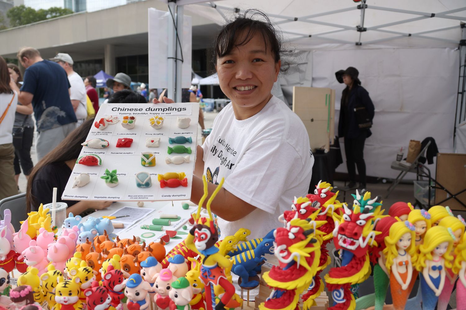 9月2日,在加拿大多伦多市政广场举行的第四届多伦多龙文化节上,一位面塑艺人向记者展示其创意面塑作品。(图片来源:中新社)