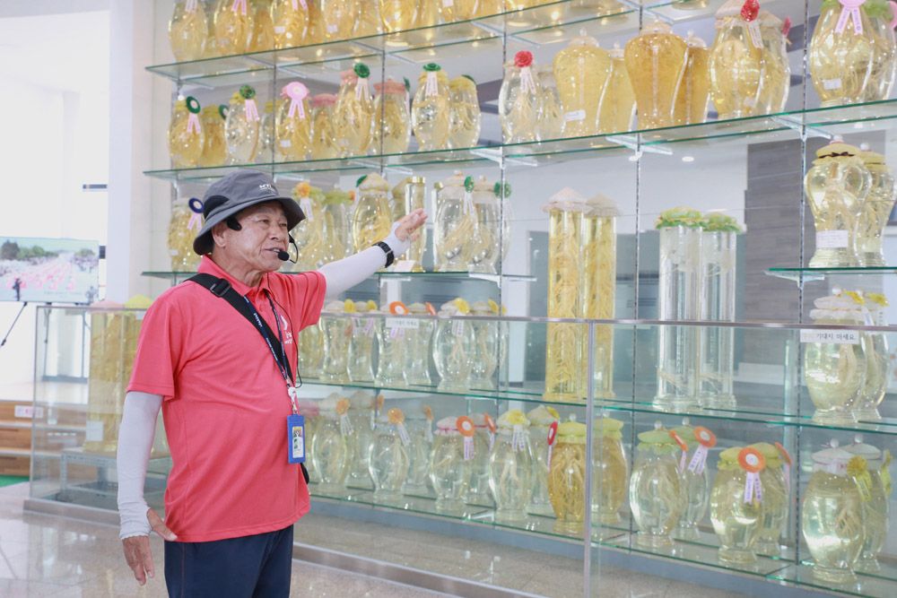 9月5日,讲解员在韩国忠清南道锦山的人参馆内介绍获奖人参。