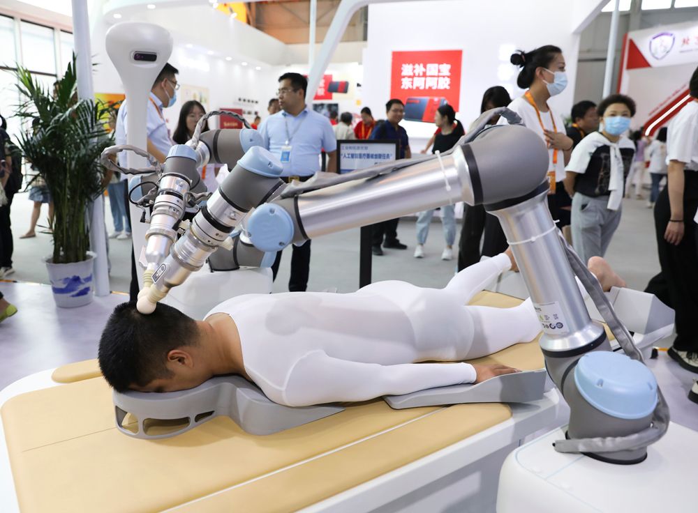 本届服贸会中医药主题展区及相关会议迎来了23个国家和地区的嘉宾代表,数量超过往届。北京市中医局局长屠志涛说,此次中国共有19个省区市约150家机构参展参会,推出的产品包括药品、诊疗技术及服务、智能诊疗仪器、智能可穿戴设备等。图为观众在首钢园区的健康卫生服务专题展体验数字中医循经治疗机器人的治疗。(图片来源:中新社)