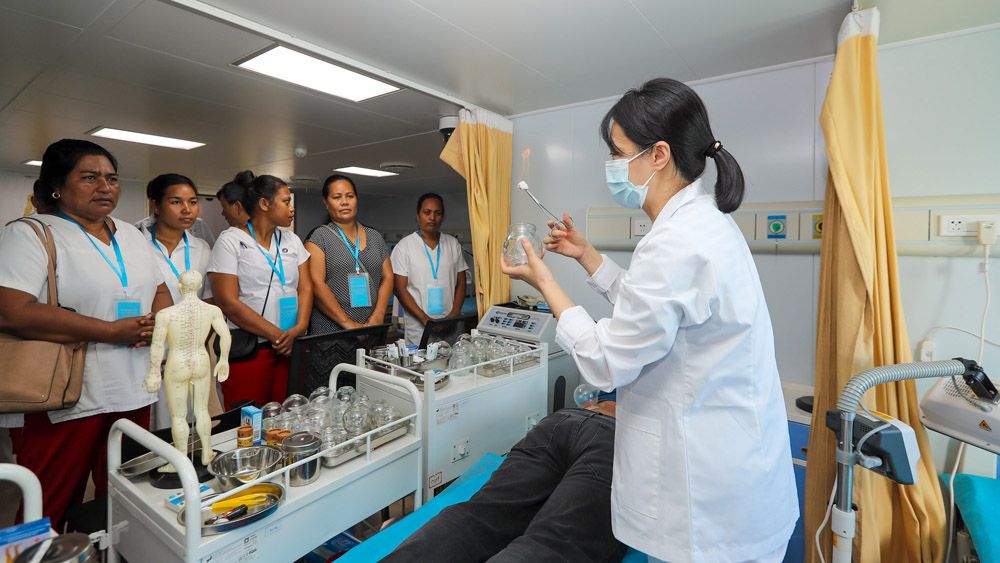 7月17日,中国海军“和平方舟”号医院船中医大夫在向基里巴斯医护人员讲解中医诊疗手法。