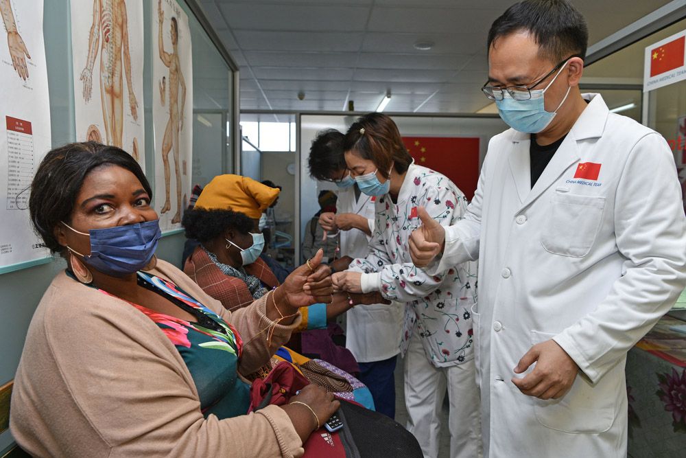 6月21日,纳米比亚首都温得和克卡图图拉医院中医诊疗室,等待治疗的患者与中国医护人员互动。