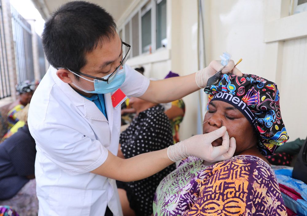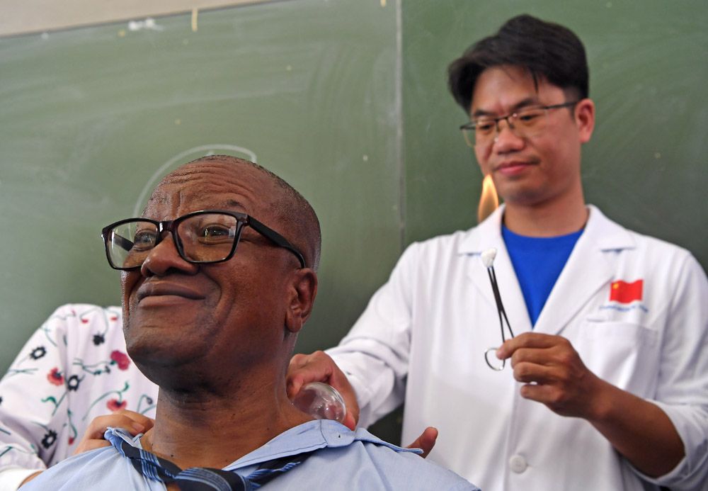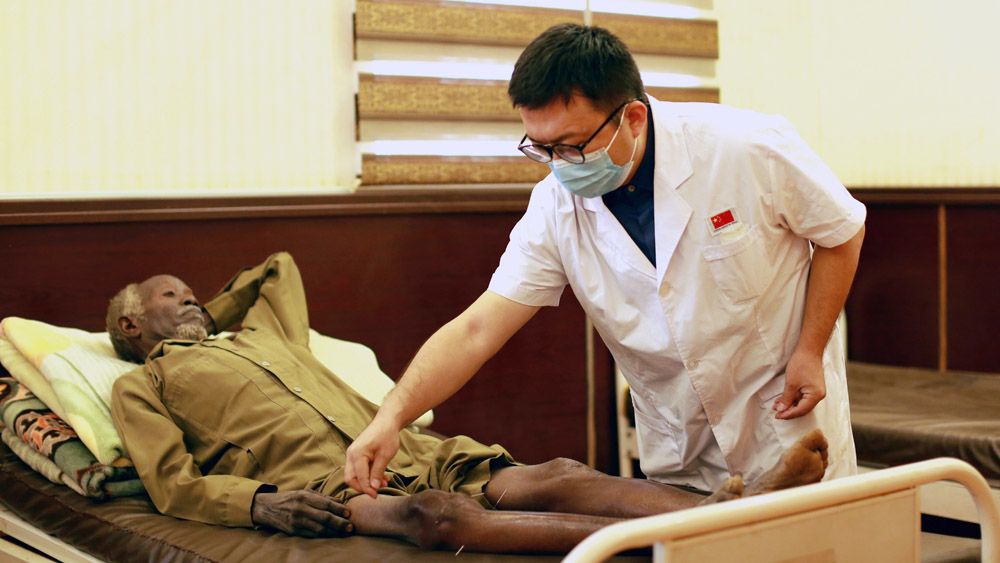 6月14日,在赤道几内亚首都马拉博的马拉博地区医院中医骨科门诊,当地患者接受中国医疗队医生吴培玉的中医治疗。中医药为全球治疗人数已达世界总人口的三分之一以上,据世界卫生组织统计,有113个世卫组织会员国认可使用针灸。