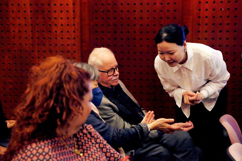 3月2日,在马耳他瓦莱塔,马耳他大学中医中心医师张珉教观众如何搭脉。