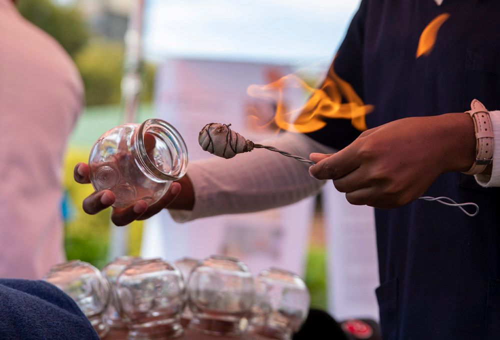 3月17日,在南非约翰内斯堡大学,学生在中医推广活动中体验拔罐。