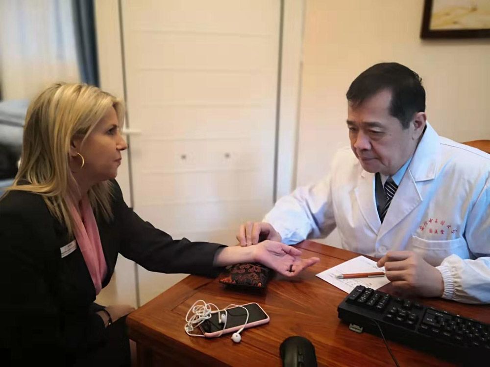 在位于希腊雅典的安徽中医药大学雅典中医药中心,安徽中医药大学第一附属医院杨骏教授为希腊民众把脉问诊。