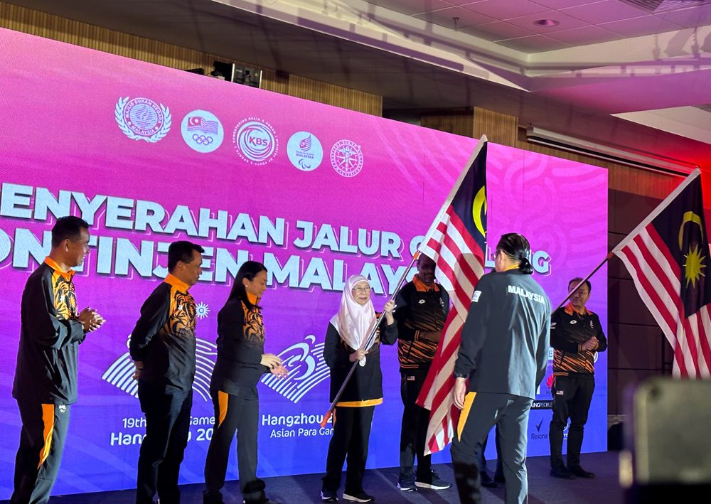 杭州第19届亚运会开幕前夕,马来西亚亚运会代表团和亚洲残疾人运动会代表团11日举行授旗仪式。图为主持授旗仪式的马来西亚总理夫人旺·阿兹莎为代表团授旗。(图片来源:中新社)