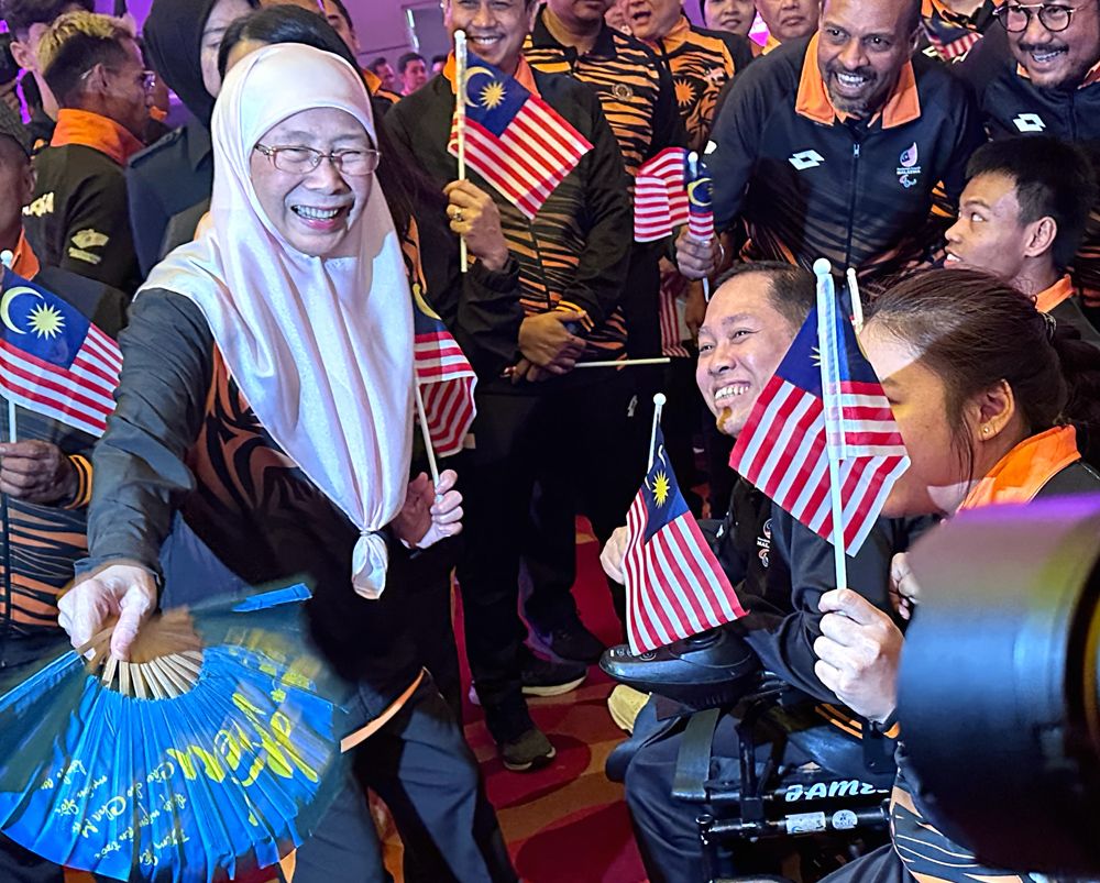 主持授旗仪式的马来西亚总理夫人旺·阿兹莎为运动员“扇风”加油。(图片来源:中新社)