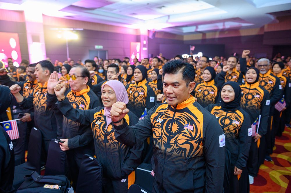 9月11日,马来西亚代表团成员在授旗仪式现场。当日,第十九届杭州亚运会马来西亚代表团在吉隆坡举行出征授旗仪式。(图片来源:新华社)